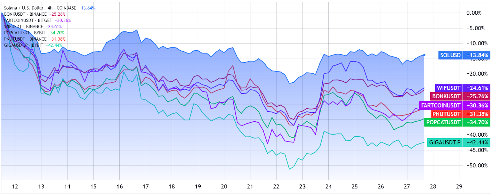 The appeal of the memecoin sector continues to fade, with most tokens losing 25% or more in the past 16 days. Giga dropped 42%, Popcat 35%, Fartcoin and PNUT both 31%, while Bonk and WIF each declined 25%. These losses dampen enthusiasm about Solana’s rising DEX market share.