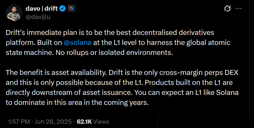 Davo, from Drift Protocol, noted that Solana’s robust base layer supports “asset availability,” meaning tokens can be natively used as collateral. He also emphasized the absence of an “offchain matching engine,” which helps protect DEX users from transaction reordering or prioritization.