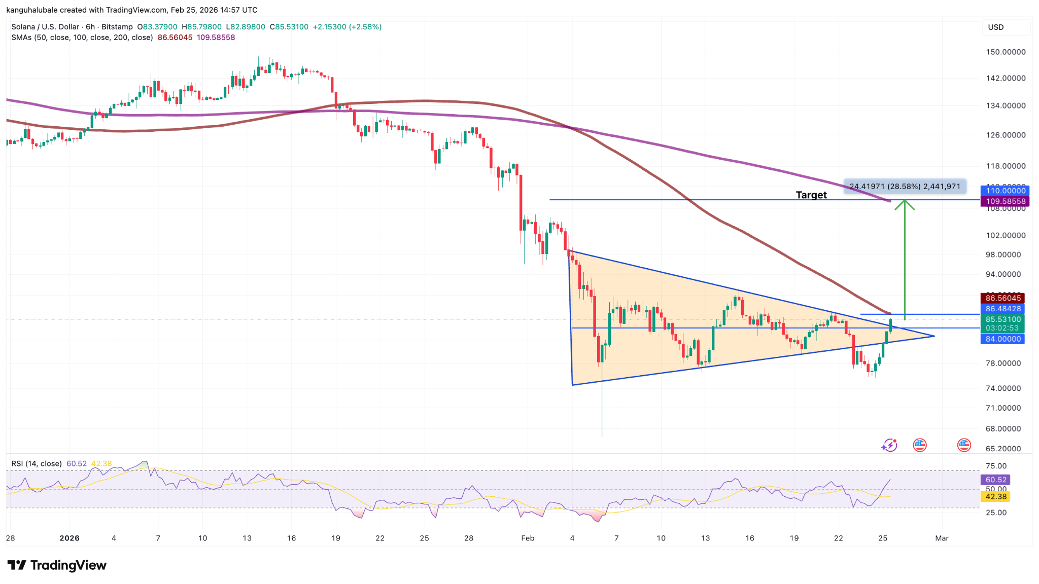 Solana’s symmetrical triangle breakout targets $110 SOL price.