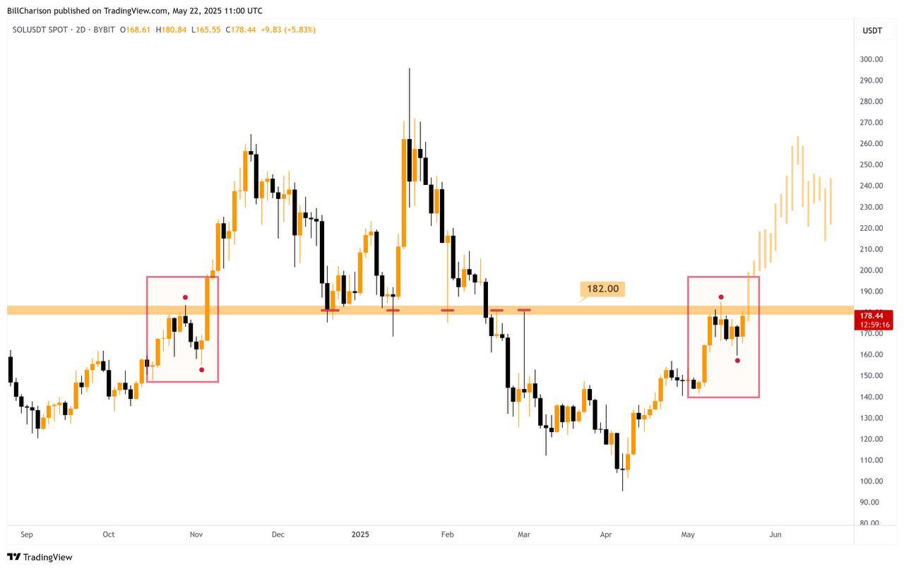 Crypto trader Robert Mercer shared a chart identifying a price fractal pattern similar to October 2024. Mercer emphasized two critical zones: one around late 2024, where SOL broke past $180 after consolidation, and a current zone mirroring that setup. He predicts a breakout above $180 could trigger a sharp upward rally, mirroring the late 2024 rally that saw $SOL peak near $260.