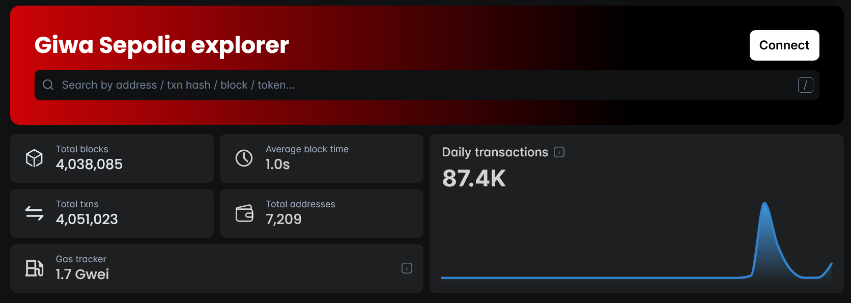 However, with over 4 million blocks added to Giwa Sepolia, a one-second block time rate suggests the chain may have launched earlier.