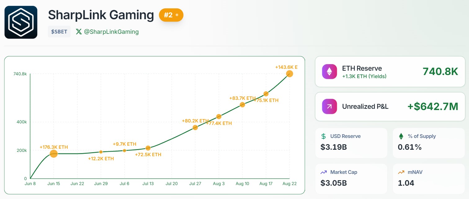 SharpLink is currently the second-largest ETH treasury holder next to Bitmine Immersion Tech, which has 1.5 million ETH.