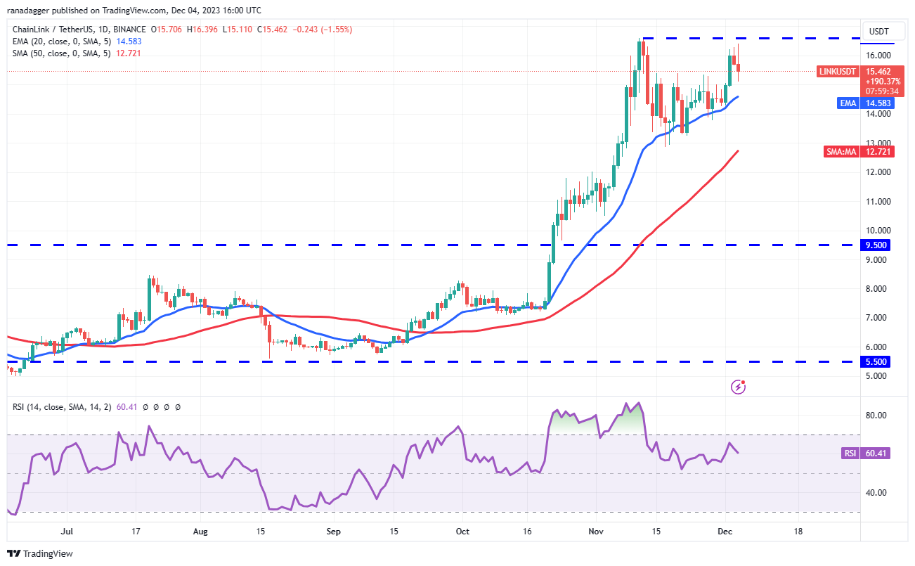 The upsloping moving averages and the RSI in the positive territory indicate that the bulls are in command. If they propel the price above $16.60, the LINK/USDT pair could signal the resumption of the uptrend. The pair may then sprint toward $18.30.