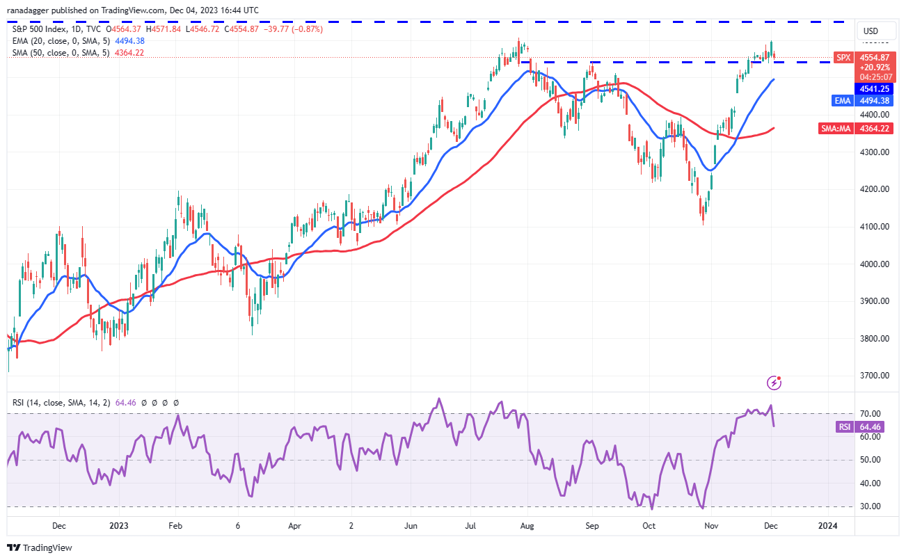 Meanwhile, the bears are likely to have other plans. They will try to pull the price below the breakout level of 4,541 and then the 20-day exponential moving average (4,494). That will clear the path for a collapse to the 50-day simple moving average (4,364).