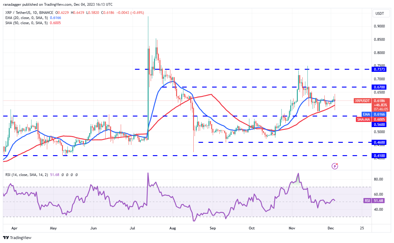 The XRP/USDT pair formed a large outside-day candlestick pattern on Dec.4, indicating a tough tussle between the bulls and the bears. The 20-day EMA ($0.62) is flattening out, and the RSI is near the midpoint, indicating a balance between supply and demand. That suggests the pair may oscillate between $0.67 and $0.56 for a while.