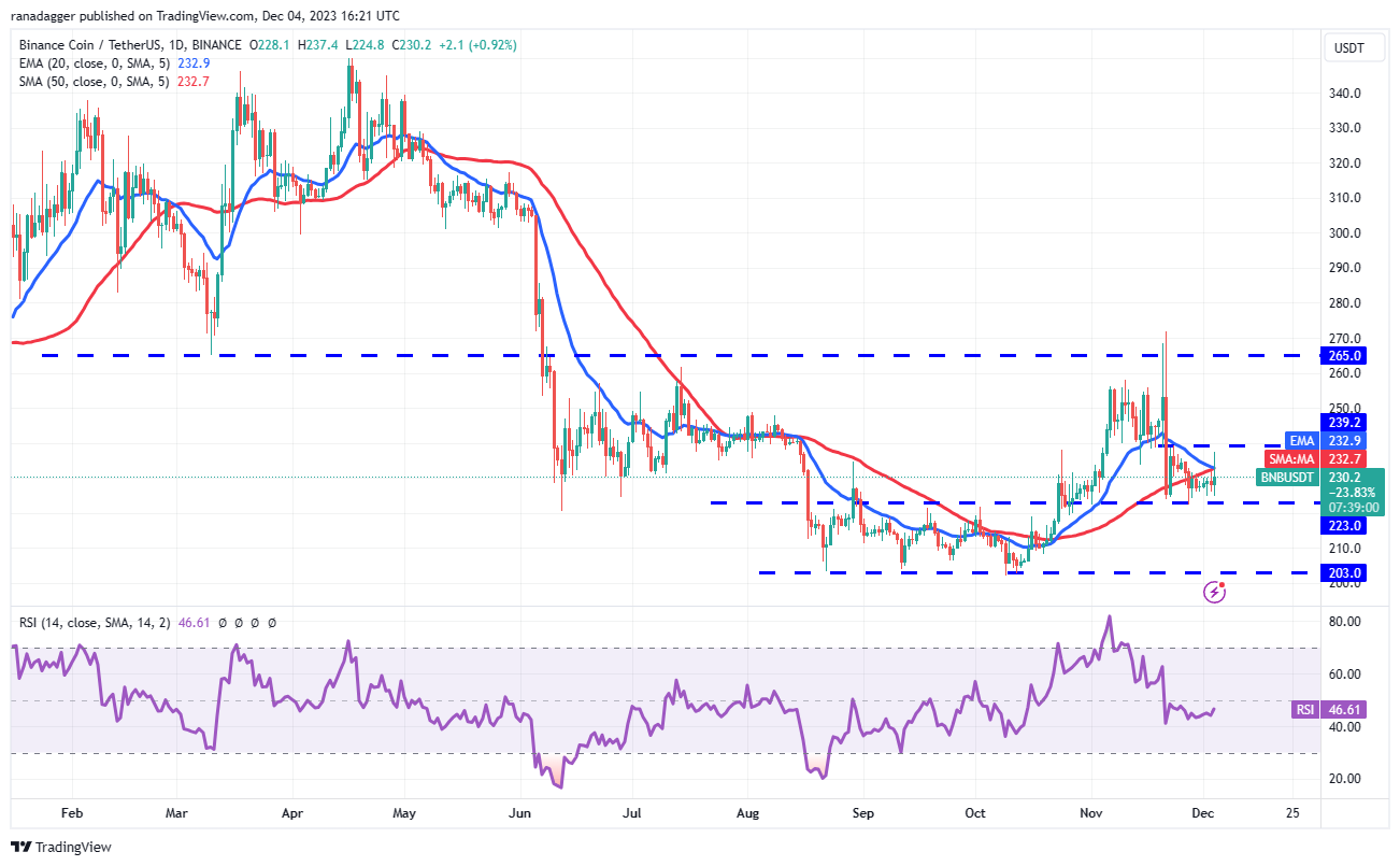 The downsloping 20-day EMA ($233) and the RSI just below the midpoint indicate that bears have a slight edge. If buyers overcome the obstacle at $239, the BNB/USDT pair could pick up momentum and rally to $265.