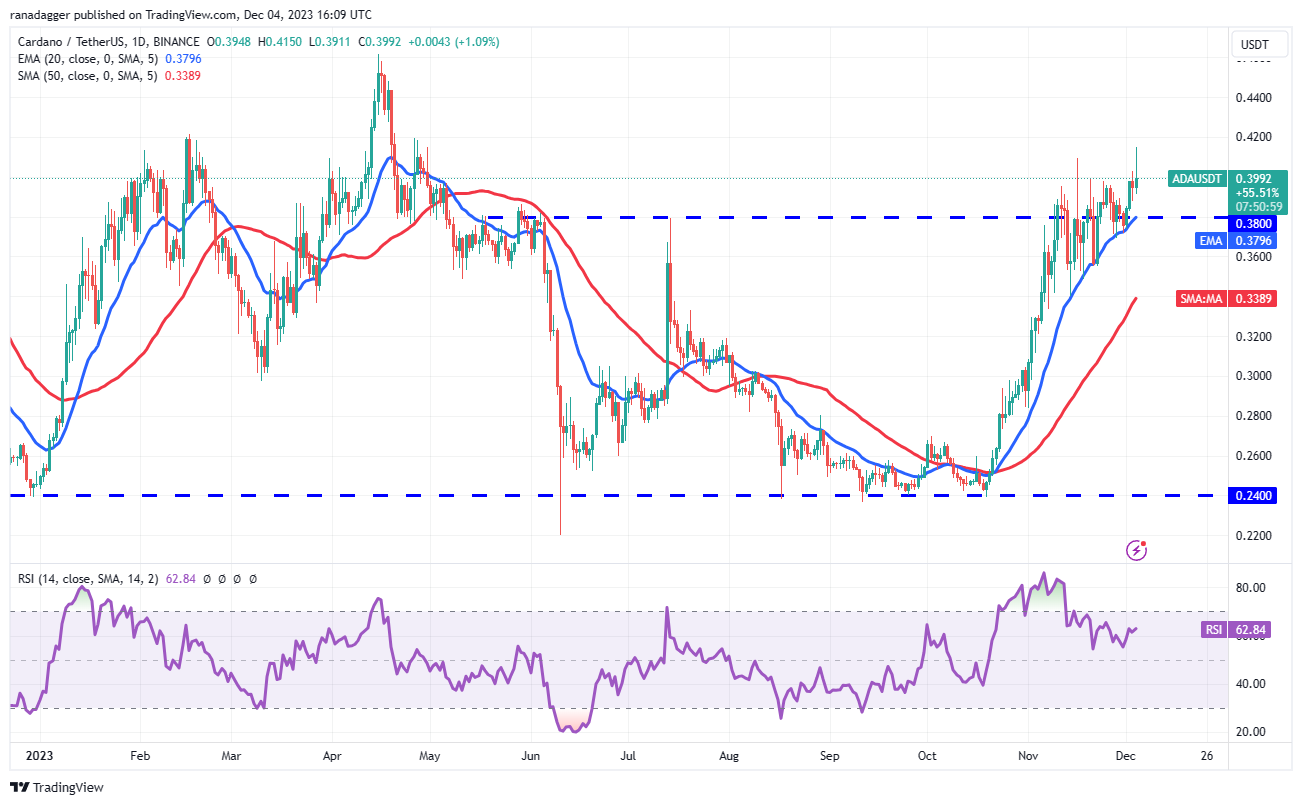 Buyers propelled Cardano (ADA) above the overhead resistance of $0.40 on Dec. 4, but they are struggling to sustain the higher levels.