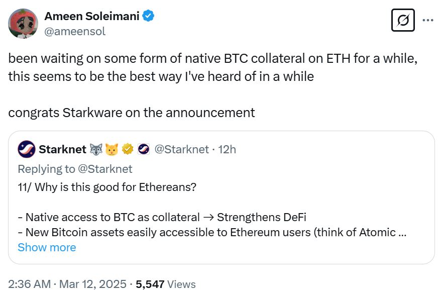 Meanwhile, in a March 11 X space discussing Starknet’s plan, Ethereum co-founder Vitalik Buterin said a proper Bitcoin L2 that can satisfy the needed security properties would “make crypto payments great again, and all those use cases can work.”