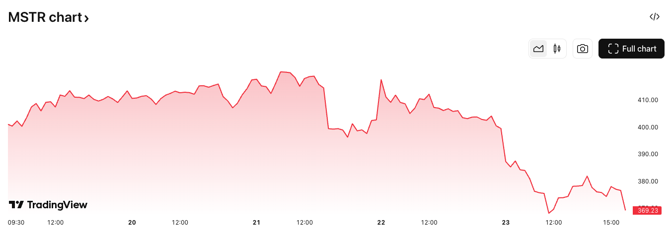 In the meantime, Strategy’s shares have been tumbling from their all-time highs recently, losing at least 12% in the past week, with prices falling from around $420 to $369, according to TradingView data.