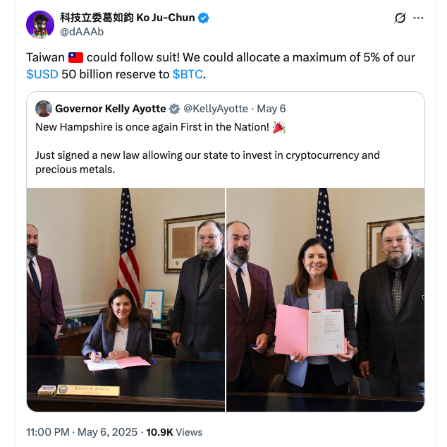 He previously suggested that Taiwan could allocate a maximum of 5% of its $50 billion reserve to Bitcoin in an X post on May 6.