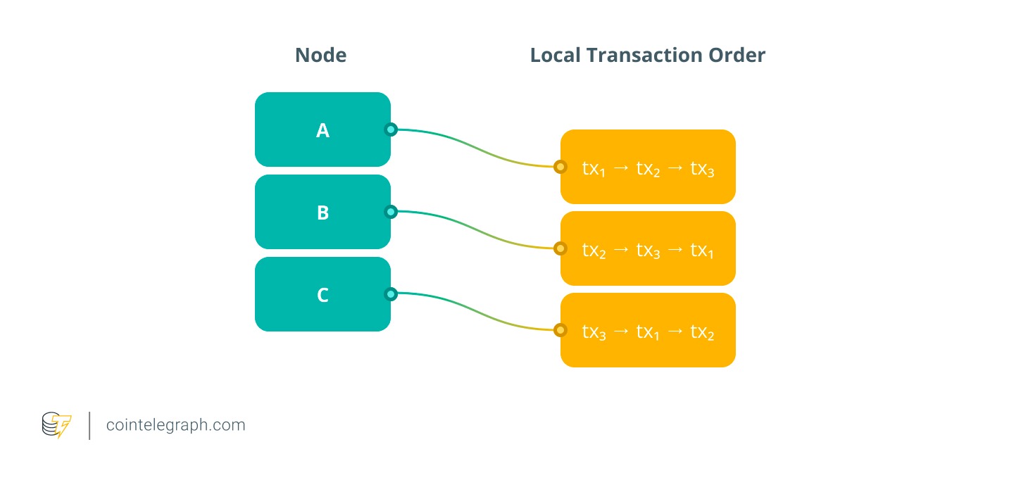 Consider three consensus nodes (A, B and C) and three transactions: tx₁, tx₂, and tx₃. A transaction is considered “received earlier” if at least two of the three nodes (a majority) observe it first.