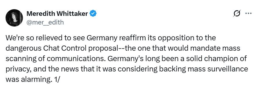 The president of messaging app Signal, Meredith Whittaker, said on Thursday that while Germany’s opposition to the measure is a relief, she warns that “the war is not over,” because it now moves to “the European Council, where the issue is unresolved.”