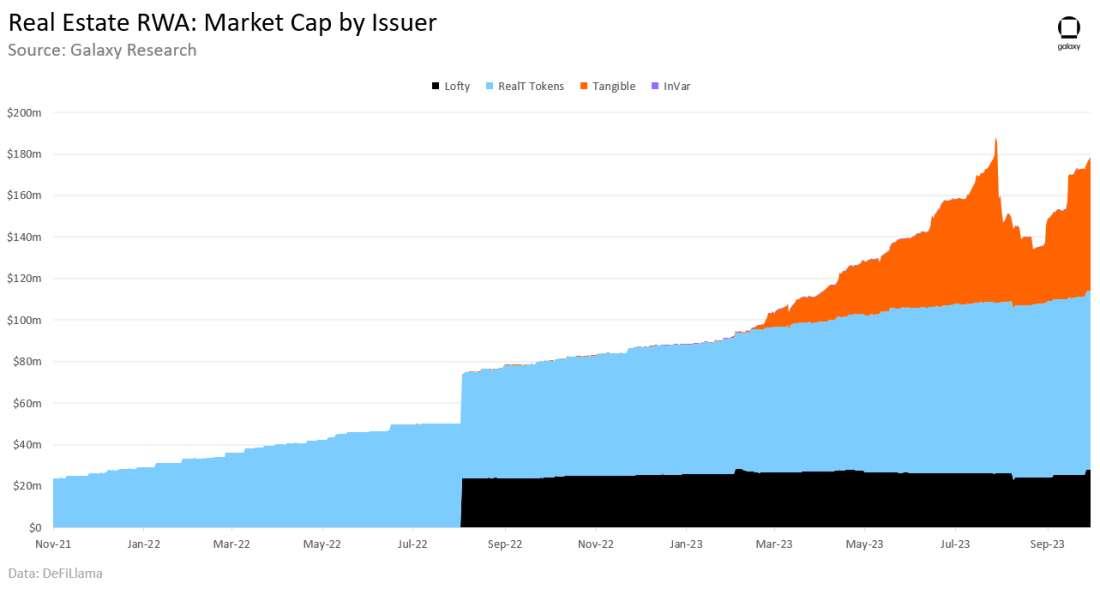 The aggregate value of assets tokenized, which in some cases represent fractionalized claims on real estate, stands at $178 million as of Sept. 30. RealT, an issuer of tokenized real estate, holds the lion’s share of the market. Tangible, a fellow issuer of real estate-centric RWAs, witnessed the most growth among its peers. The total value of Tangible’s tokens soared from a mere $100,000 to an impressive $64 million over the first three quarters of 2023.