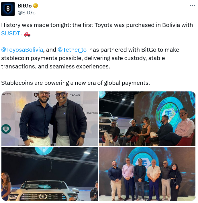 BitGo said it partnered with Tether and Bolivia Toyota to assist it with self-custody while ensuring the transactions run smoothly