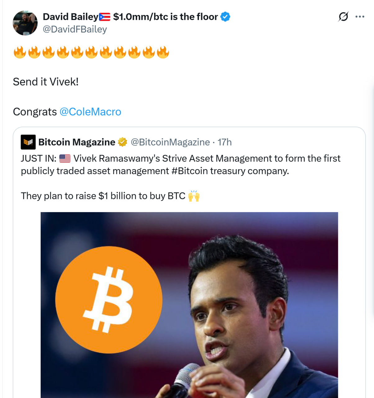 On May 7, Strive Asset Management, founded by entrepreneur and former presidential candidate Vivek Ramaswamy, also revealed plans to transition into a Bitcoin treasury company.