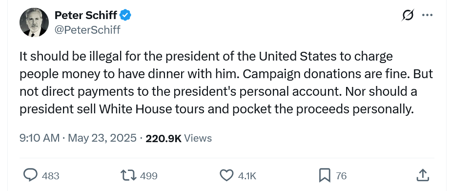 Meanwhile, 35 Democrats have called for the Justice Department to investigate Trump’s crypto dinner, as they suspect he may be accepting foreign investments in violation of federal bribery statutes and the foreign emoluments clause of the Constitution.