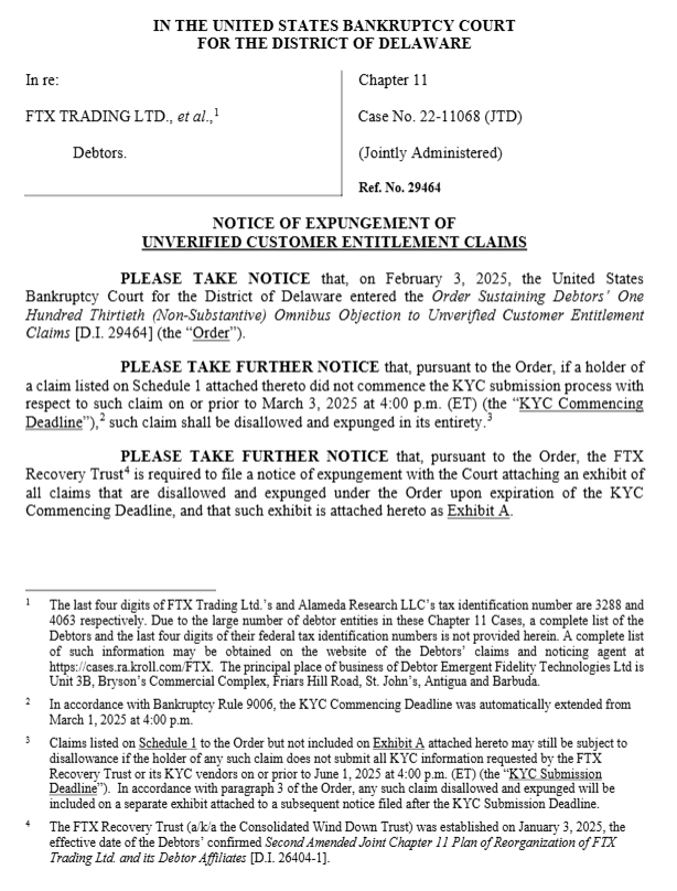 “If a holder of a claim listed on Schedule 1 attached thereto did not commence the KYC submission process with respect to such claim on or prior to March 3, 2025, at 4:00 pm (ET) (the “KYC Commencing Deadline”), 2 such claim shall be disallowed and expunged in its entirety,” the filing states.