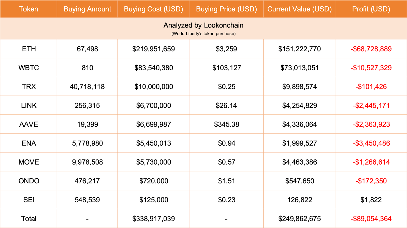 Trump’s DeFi platform is currently sitting on a total unrealized loss of over $89 million across the nine tokens it invested in, Lookonchain data shows.