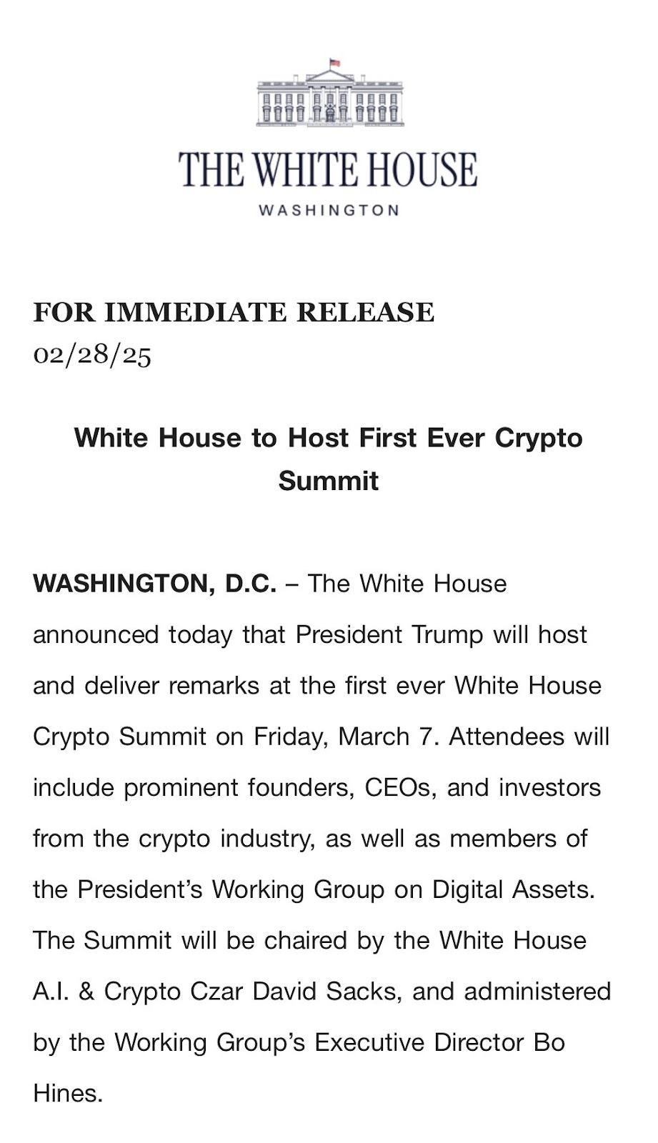Trump to host first White House crypto summit on March 7