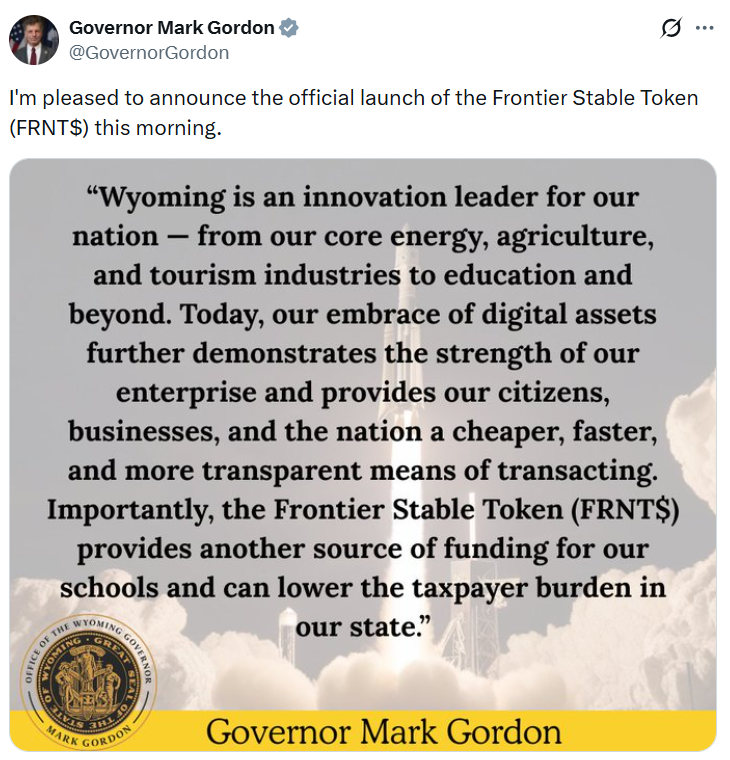Wyoming’s Frontier Stable Token (FRNT) is now available to the general public. State legislators framed the asset as a step forward for financial innovation in the state, which has boasted lax regulations for the digital asset industry.