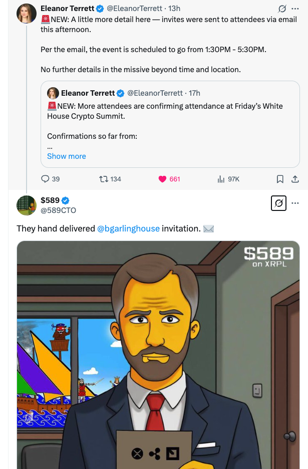 While Terrett’s list didn’t include Ripple CEO Brad Garlinghouse, he previously hinted at his attendance in a March 2 post on X soon after Trump’s crypto czar Sacks announced the summit on March 1.
