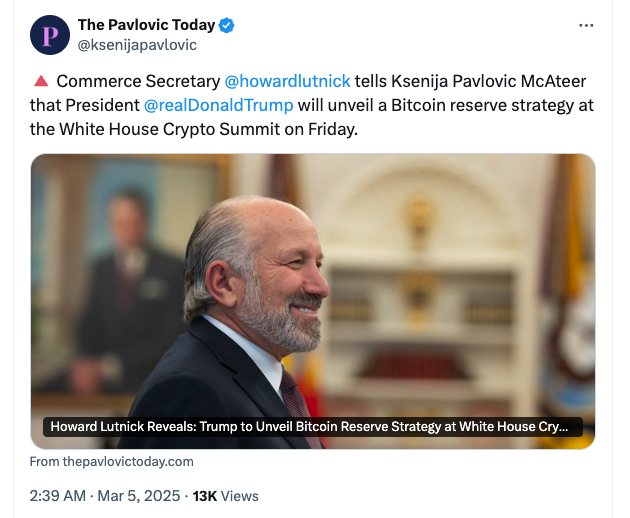 “The President definitely thinks that there’s a Bitcoin strategic reserve,” Lutnick said, according to a March 5 report by The Pavlovic Today.