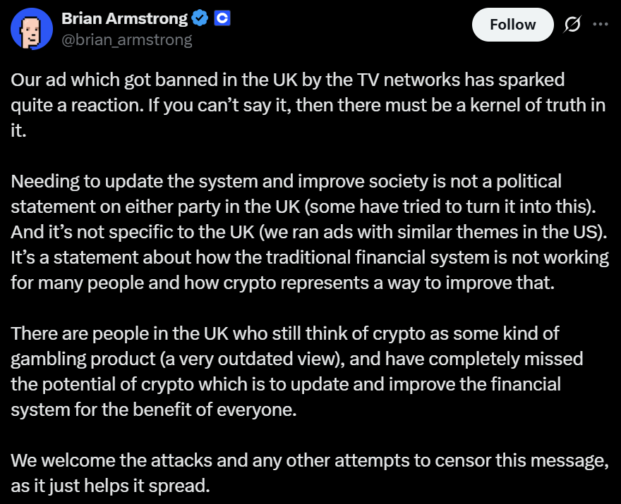 Coinbase CEO Brian Armstrong claimed last week that the ad was banned by major UK television networks. However, CNBC said it could not independently verify the claim as of Monday.