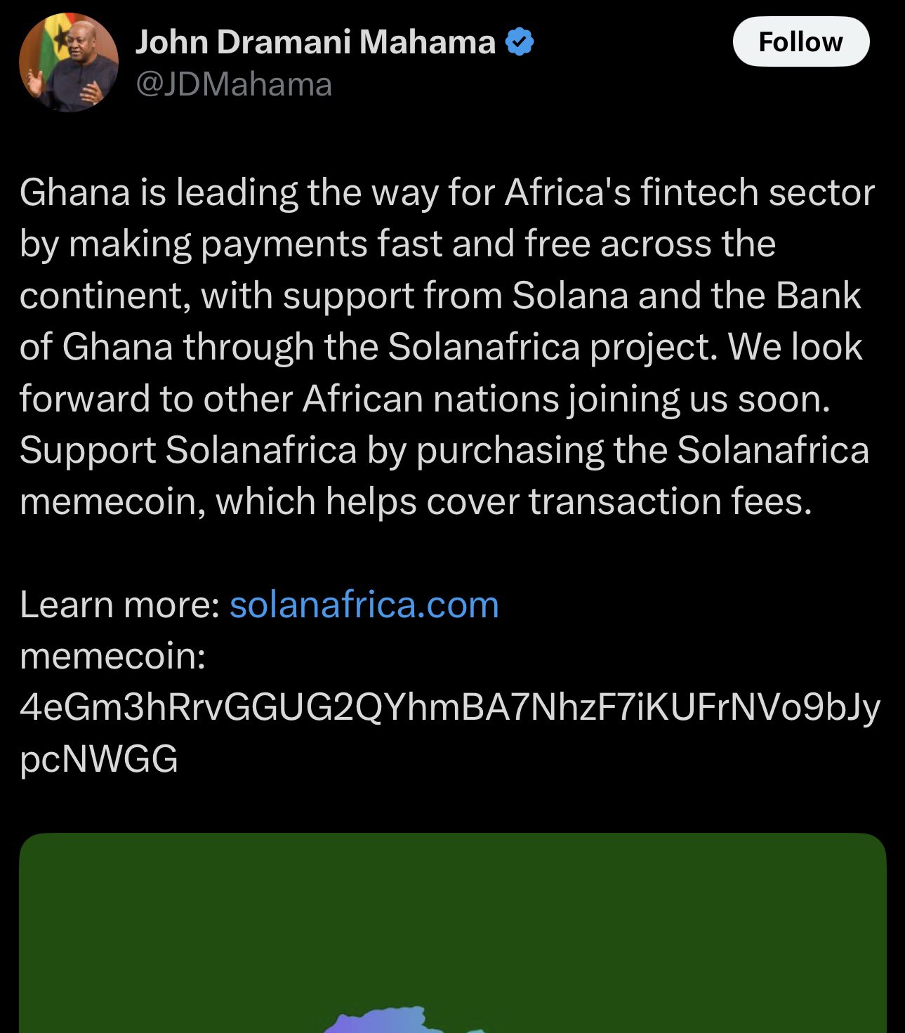 The scammers made similar crypto-promoting posts to Mahama’s 2.4 million followers, claiming that the scam project was “making payments fast and free across the continent with support from Solana and the Bank of Ghana.”