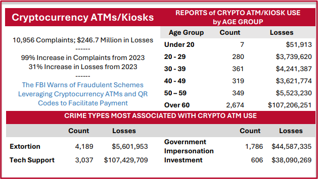 The Federal Bureau of Investigation (FBI) has noted an increasing amount of money related to criminal activity going through crypto ATMs. In 2024, the FBI received nearly 11,000 complaints of fraud cases at crypto kiosks, valuing over $246 million.