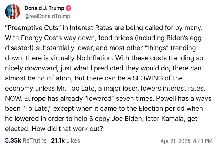 “‘Preemptive Cuts’ in Interest Rates are being called for by many,” Trump wrote on his social media platform Truth Social on April 21.