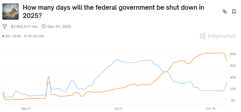 Despite Hassett’s optimism, Polymarket odds estimate there’s a 71% chance that the shutdown will last longer than 30 days, taking it to at least Oct. 31.