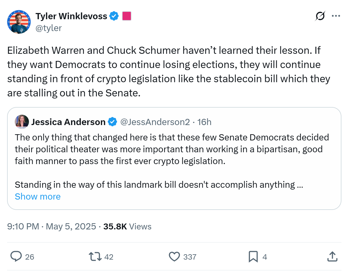 “Elizabeth Warren and Chuck Schumer haven’t learned their lesson,” Tyler Winklevoss, co-founder of Gemini, posted on X.