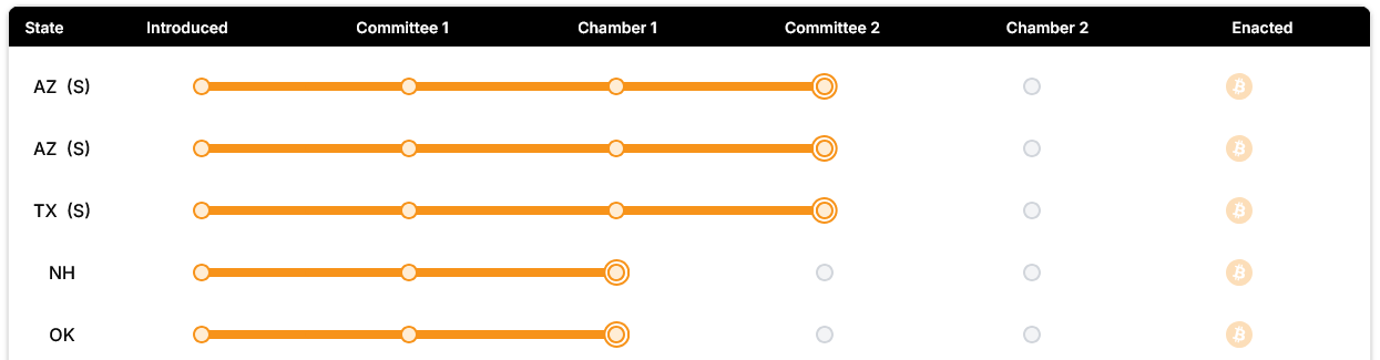 Two Arizona Bitcoin reserve bills and a Texas bill are now the closest to being passed into law, Bitcoin Laws data shows. Each of those bills obtained a successful vote in their respective Senate committees and is now awaiting a final floor vote in the Senate.