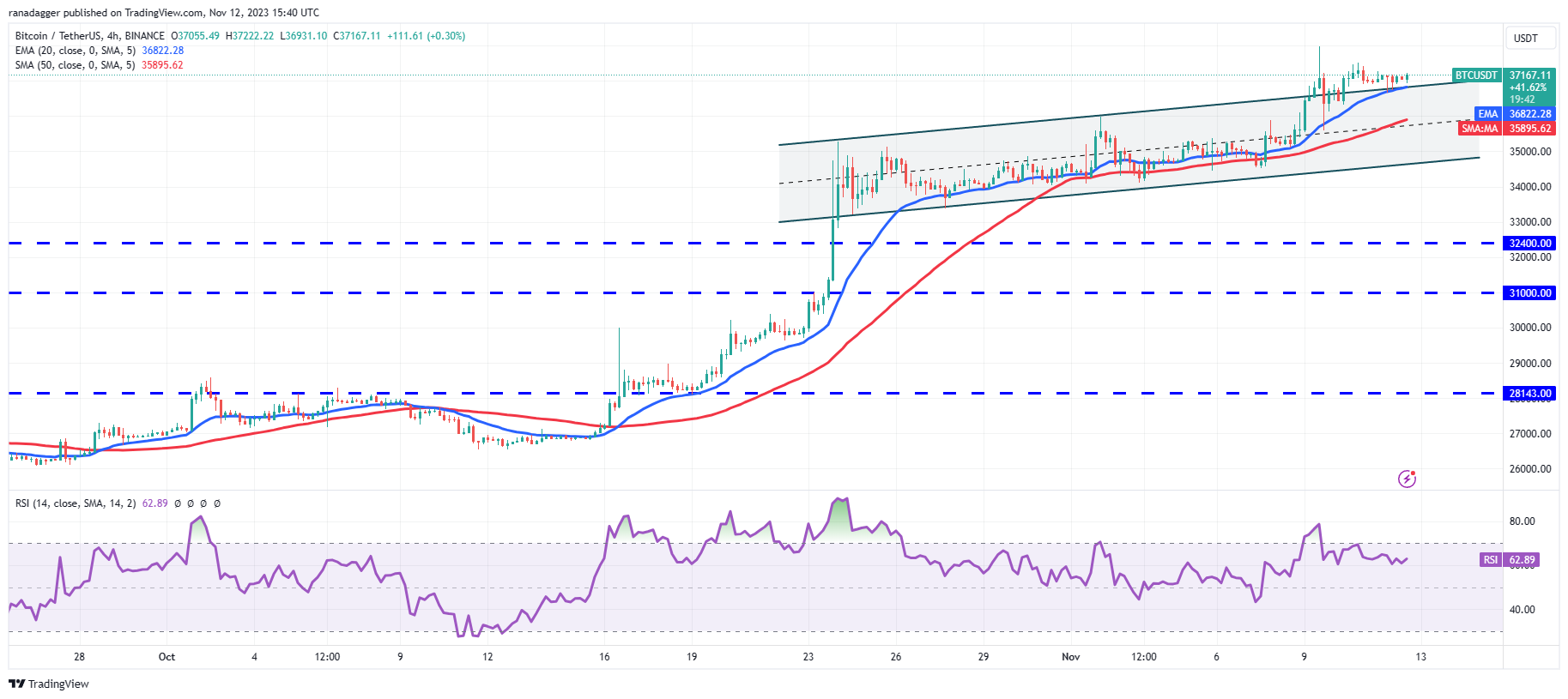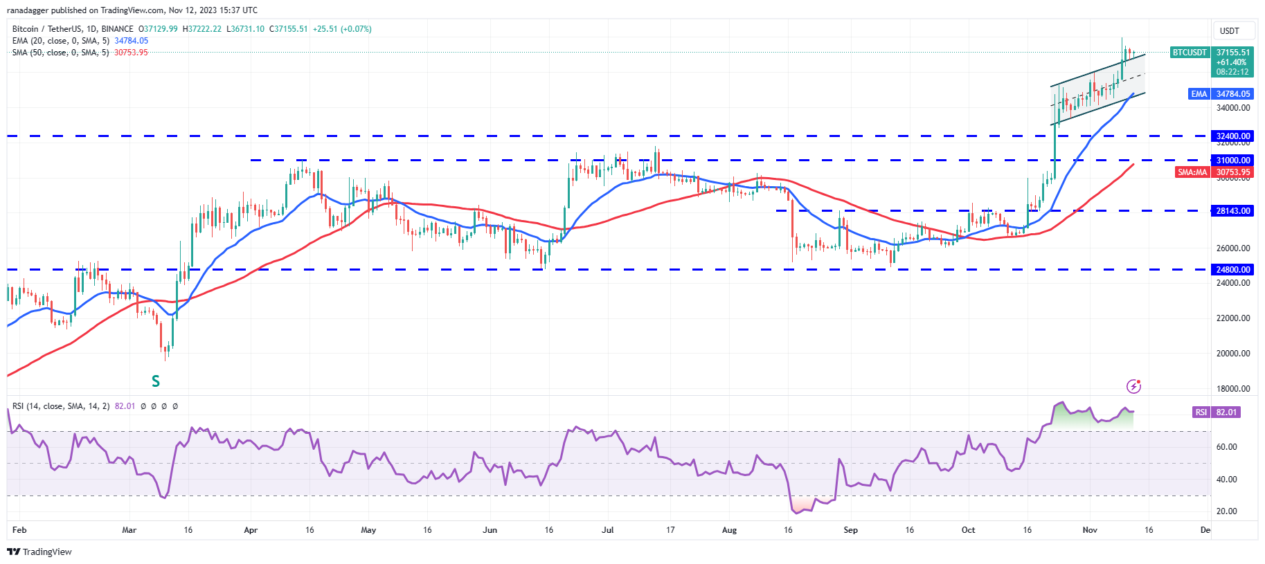 Bitcoin (BTC) is on target to end the week with gains of about 6%, indicating continued demand from the bulls. MicroStrategy co-founder Michael Saylor said during a speech at the 2023 Australia Crypto Convention on Nov. 10 that Bitcoin’s demand on a monthly basis could surge between two to 10 times by the end of 2024. Additionally, the halving will reduce the supply by half. Saylor expects both these events will cause the price “to adjust up.”