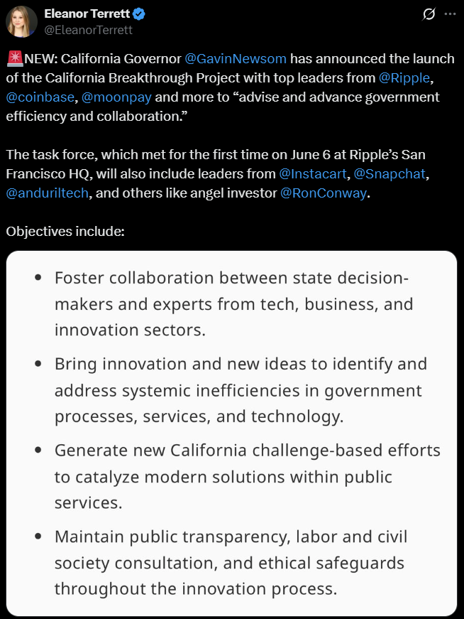 The State of California has launched the Breakthrough Project — a new initiative aimed at streamlining government operations and enhancing public services — with help from top executives in the crypto and tech sectors.