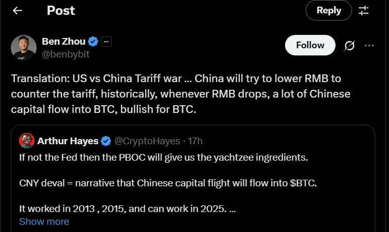 Bybit’s co-founder and CEO, Ben Zhou, agreed, arguing that China will let the yuan weaken to counter the trade war. This means “a lot of Chinese capital flow into BTC, [which is] bullish for BTC,” said Zhou.