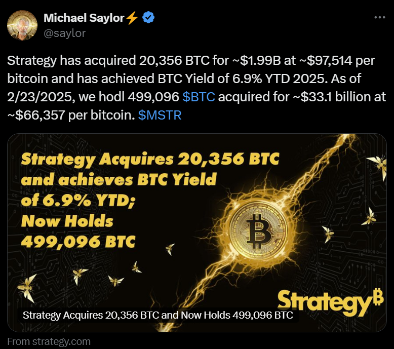 In the meantime, Strategy remains undeterred by Bitcoin price volatility. Earlier in the week, it announced that it had acquired another 20,356 BTC for $1.99 billion.