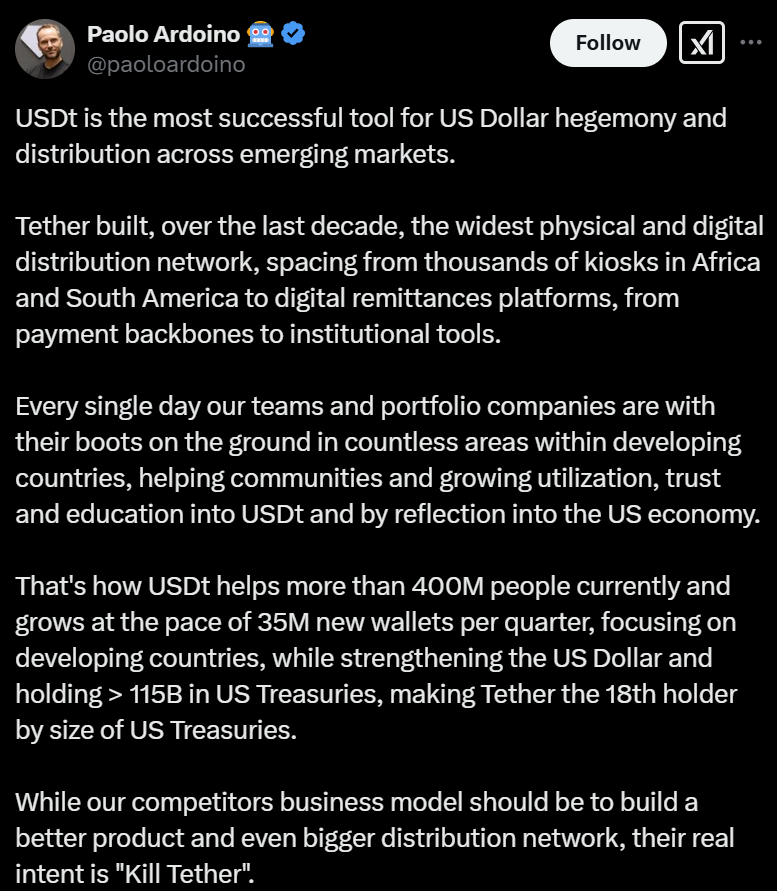 In a post on the X social media platform, Ardoino said that competitors should be focused on building a better product than Tether. However, “their real intent is to ‘Kill Tether,’” Ardoino said.