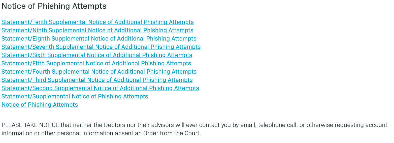 “The Debtors, the Official Committee of Unsecured Creditors, Fahrenheit, LLC, or their respective advisors will never contact you directly by phone, text message, or social media to request account or personal information absent an order or on-the-record instruction by the Court,” Celsius added.