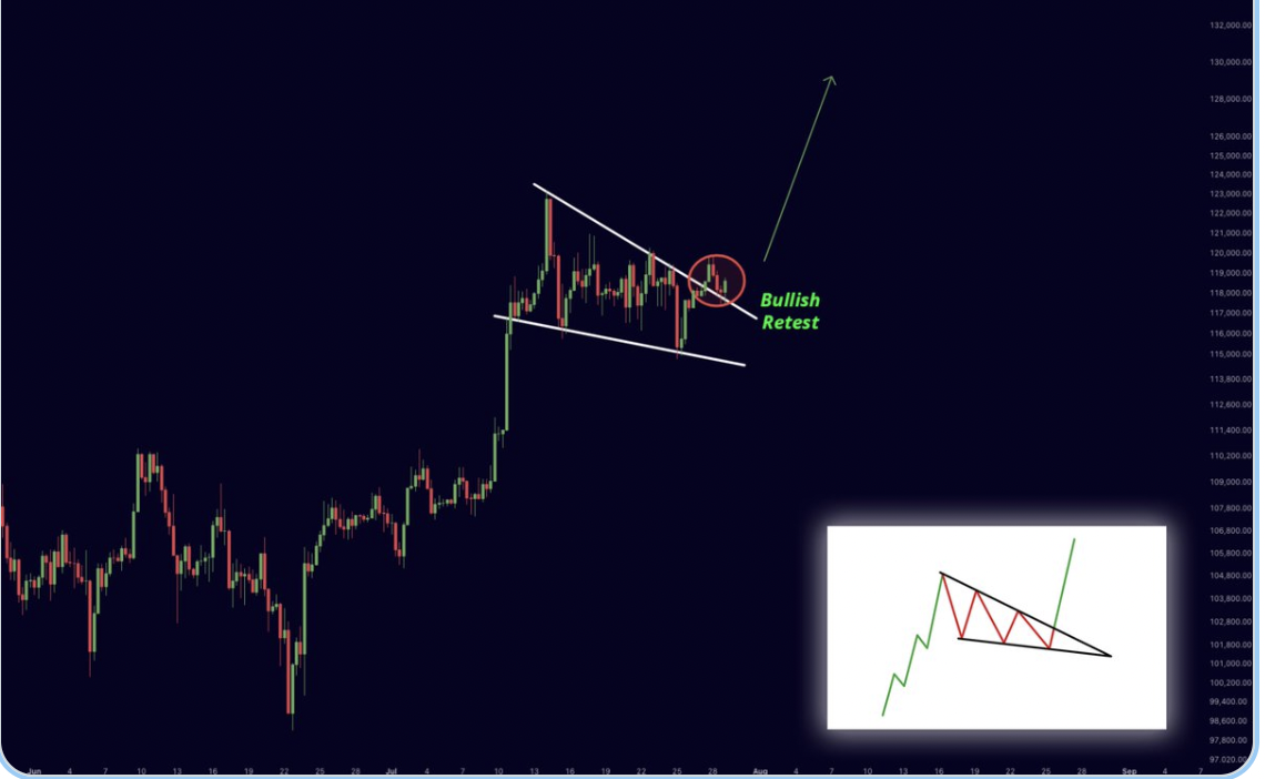 To confirm the breakout, the BTC/USD pair was required to retest the upper boundary of the wedge around $118,300 (where the 50-period and 100-period SMAs converge) and flip it into support.