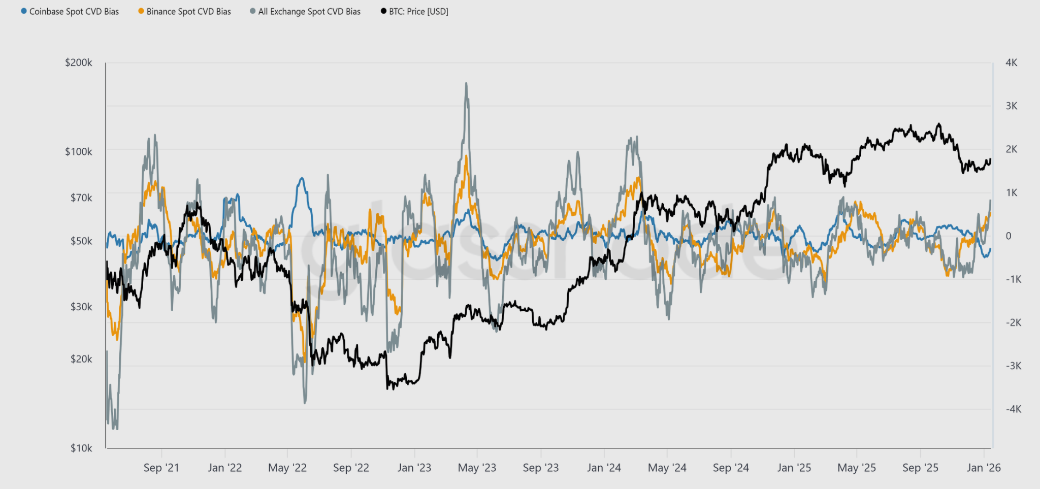 The chart below shows that Bitcoin’s spot market activity has begun to improve, with Binance and aggregate exchange cumulative volume delta (CVD) measures returning to a buy-dominant regime.