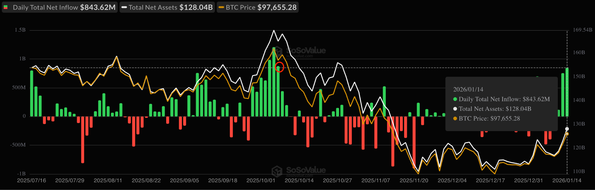 The $843.6 million recorded on Wednesday was the highest since Oct. 7, 2025, and marked the largest single-day inflows of 2026.