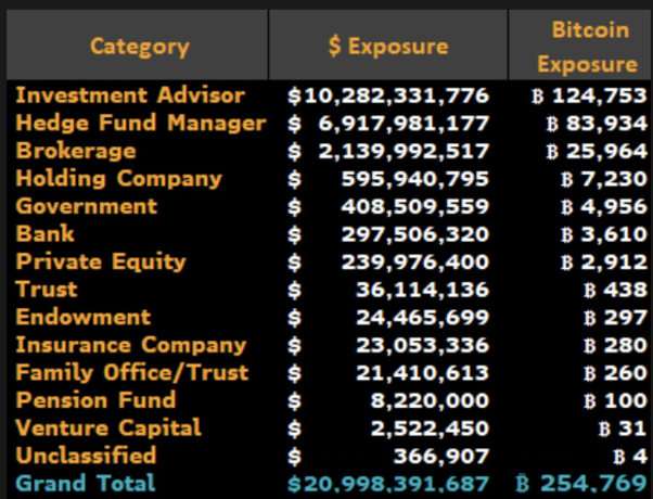 According to Bloomberg analyst Eric Balchunas, investment advisers account for nearly half of the $21 billion in assets reported through 13F filings—a growing subset of total ETF exposure that now represents around 20% of all ETF holdings. Hedge funds follow with $6.9 billion worth of ETF shares (about 83,934 BTC), followed by brokerages and holding companies.
