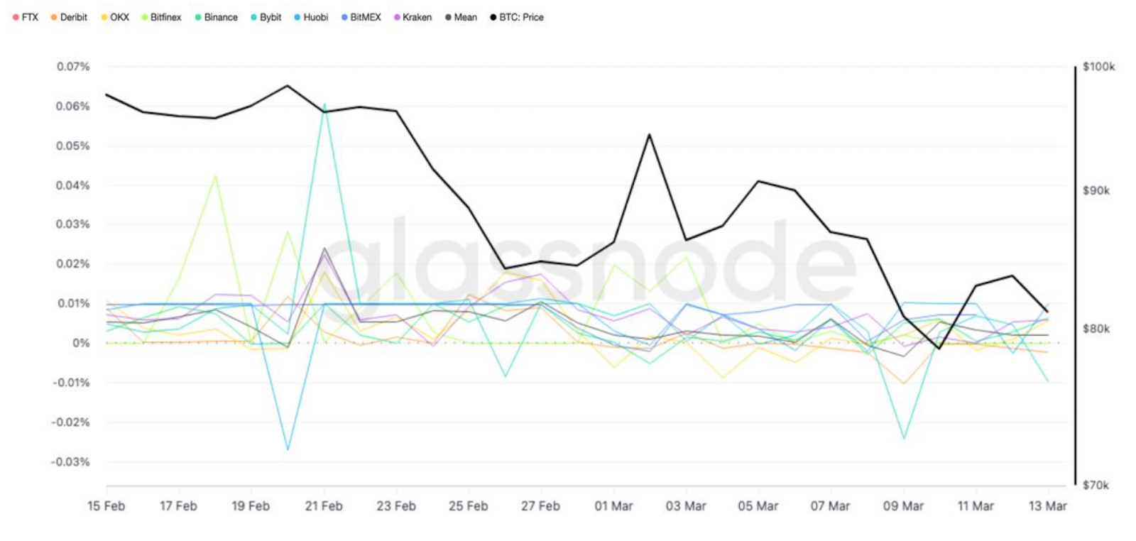 Bitcoin perpetual futures funding rates across all exchanges. Source: Glassnode