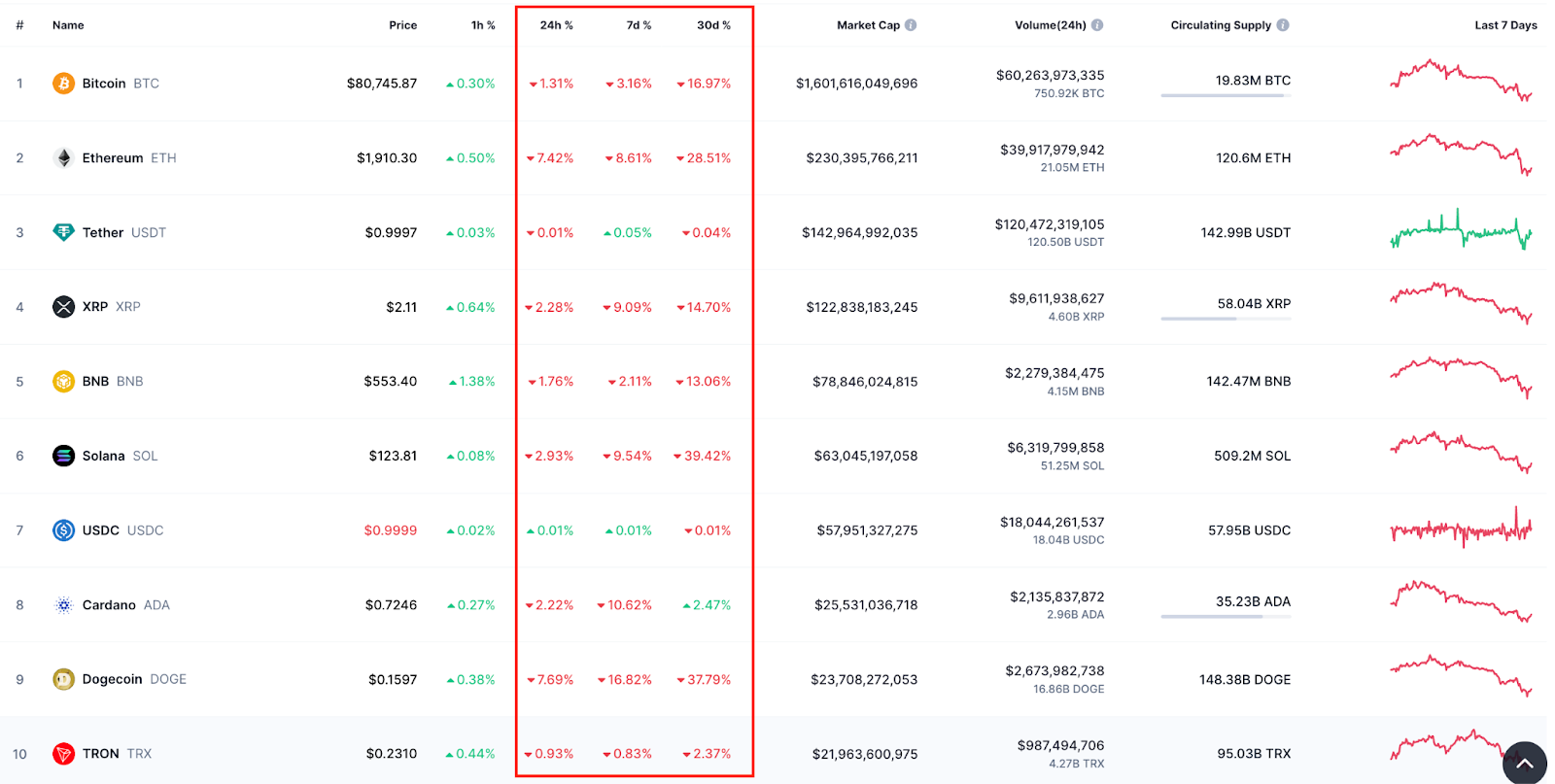 Performance of top-10 cryptocurrencies. Source: CoinMarketCapp