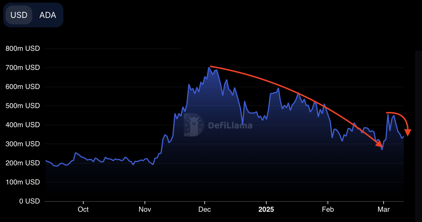 • Cardano’s TVL has plummeted from $701.4 million on Dec. 3, 2024, to reach a four-month low of $268 million on Feb. 28.