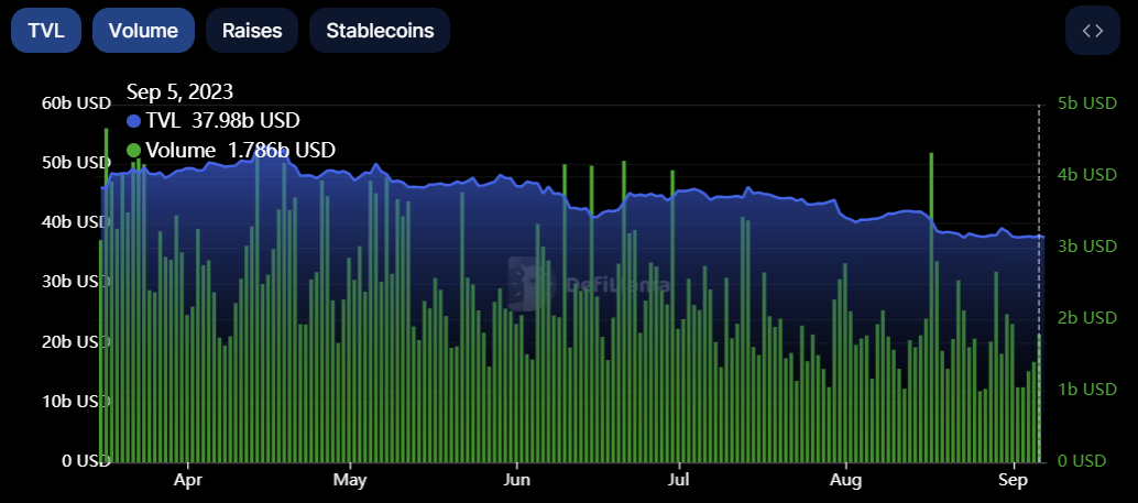 The rush of Ether liquidations comes as the entire crypto market is shedding total value locked (TVL) and volumes continue to decrease. The crypto market TVL reached a 2023 high on April 15 at $53 billion, while the current value is at $37.7 billion, reflecting a loss of over $15 billion.