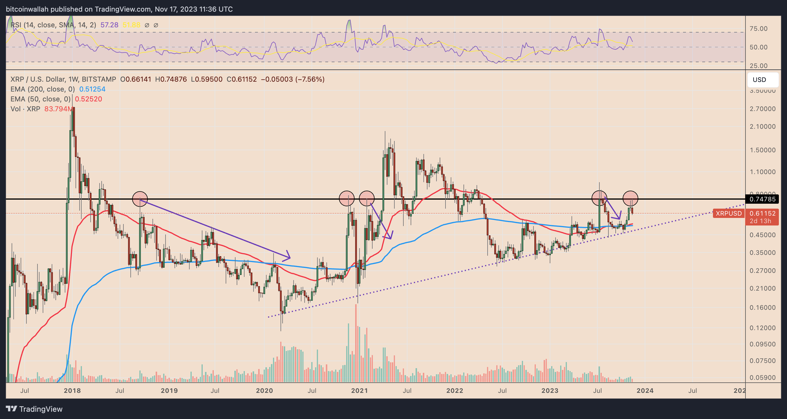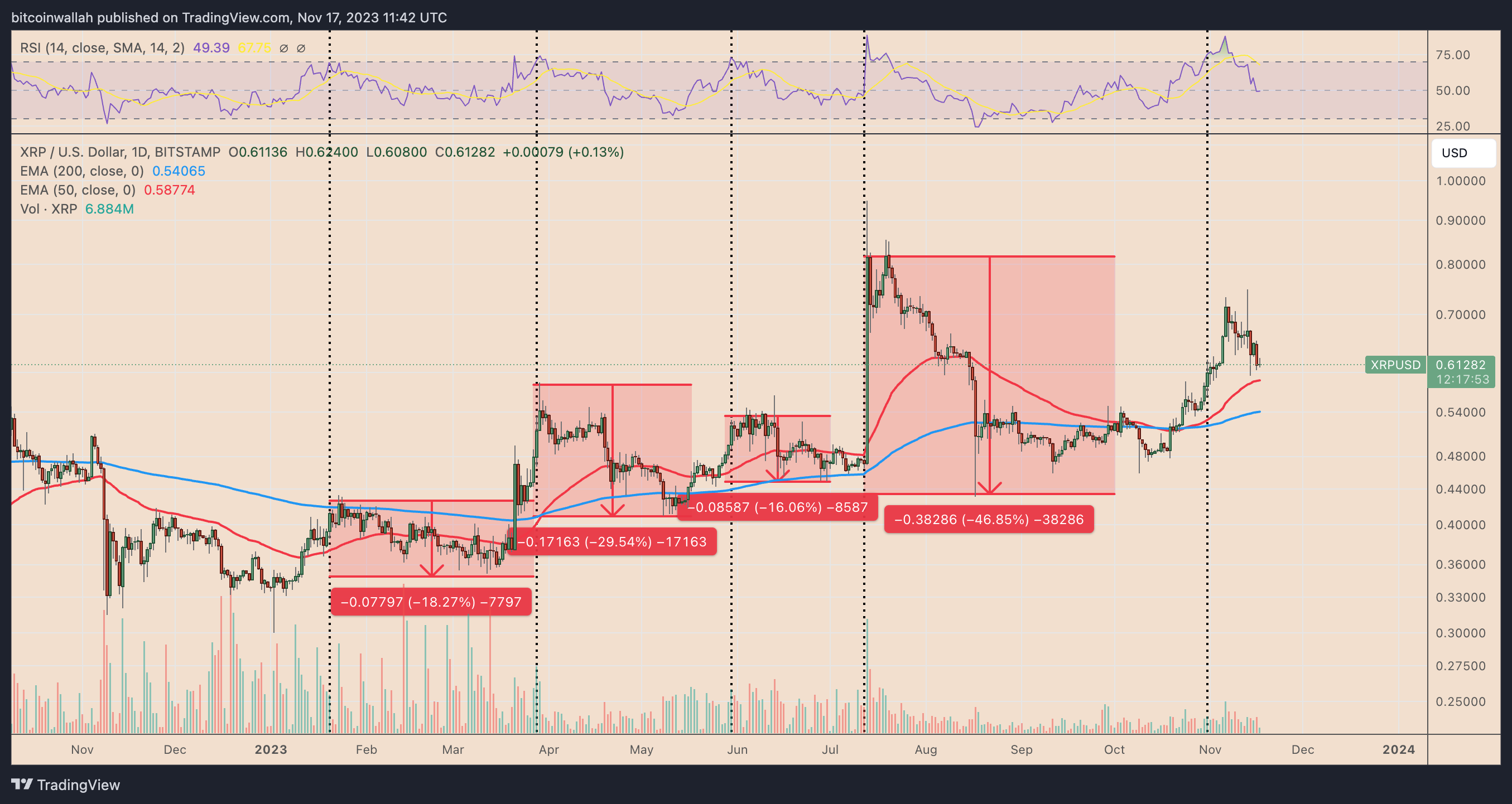 XRP/USD has been fluctuating inside a giant ascending channel since June 2022. As of November 2023, the cryptocurrency entered a correction period after testing the channel’s upper trendline as resistance.