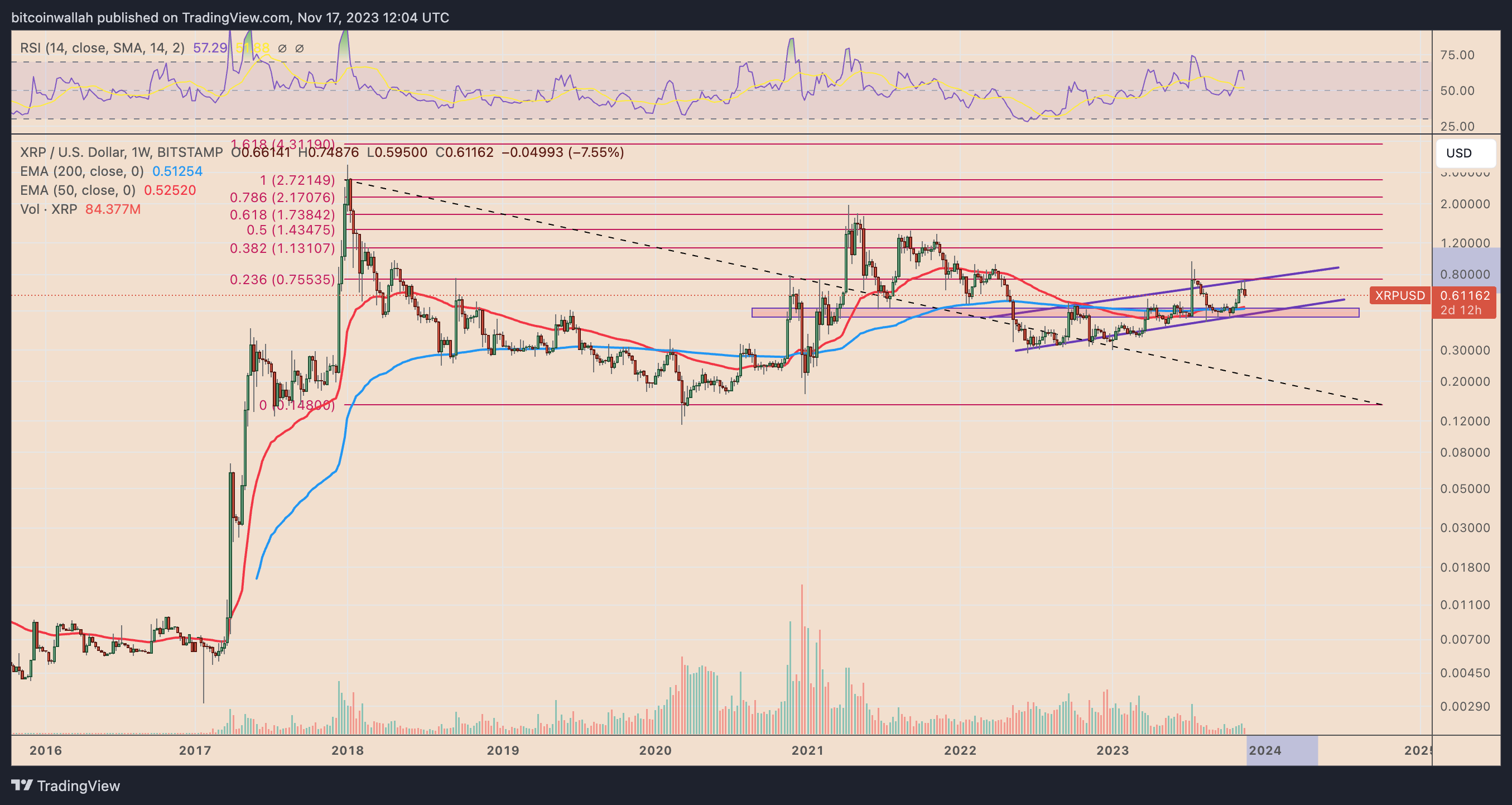 The upside target coincides with XRP’s 0.382 Fibonacci line.