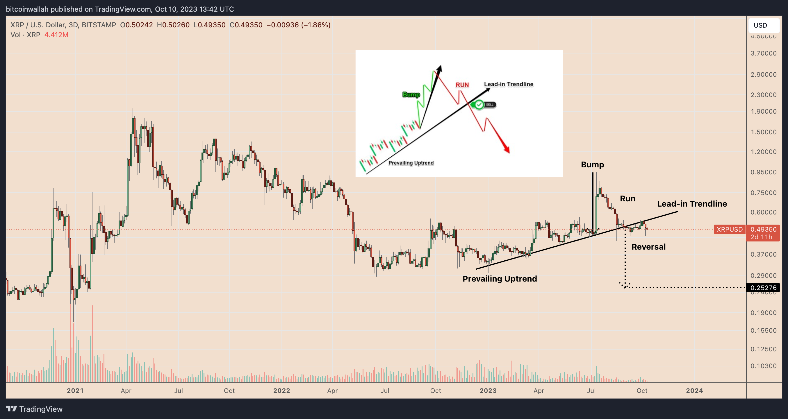 From a technical perspective, XRP’s recent price action has painted what appears to be a Bump-and-Run-Reversal (BARR) pattern.